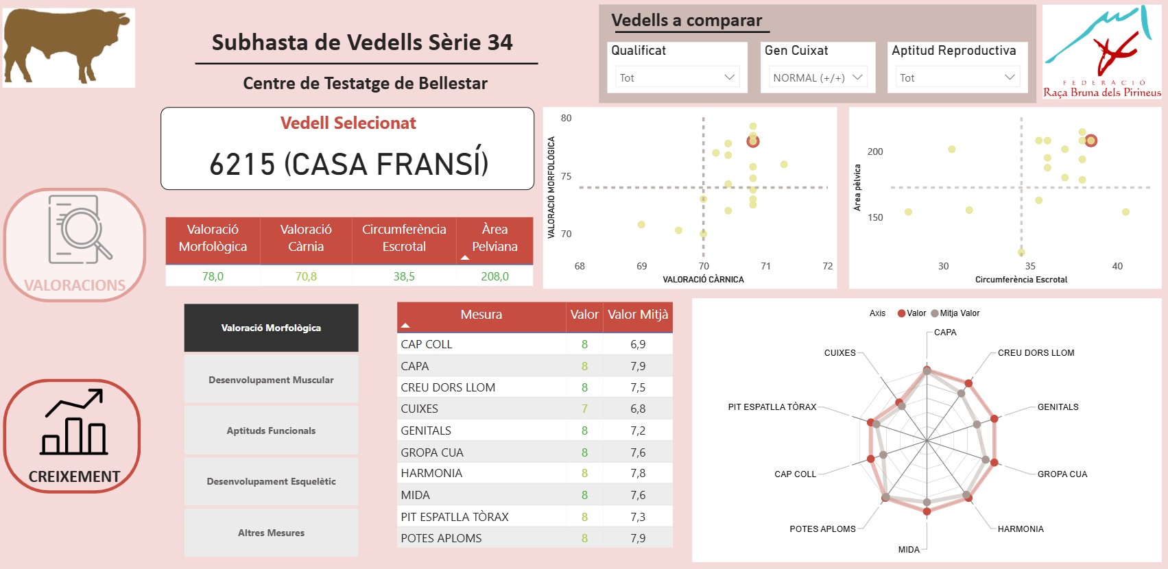 Interactive Power BI dashboard created to compare bulls participating in an official auction, visualizing their morphology, carcass quality, reproductive traits, and growth indicators in an intuitive and structured way.