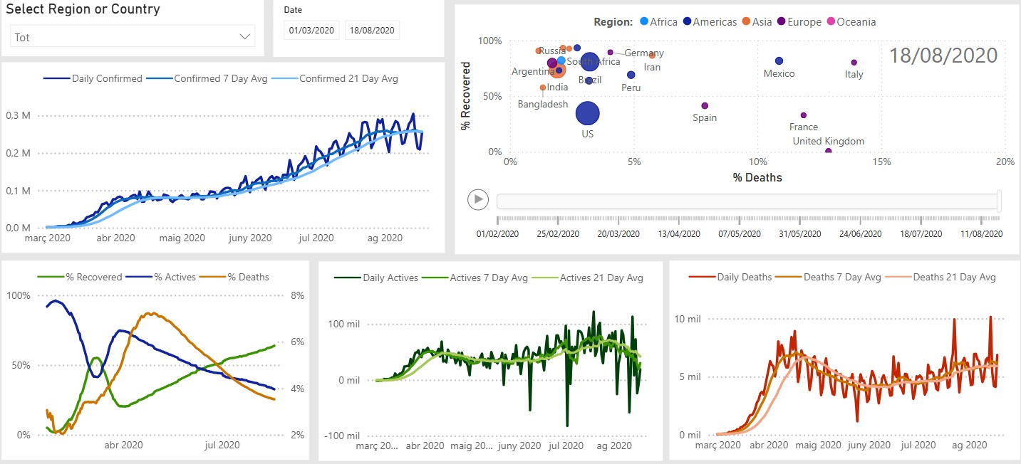 End-to-end Power BI dashboard providing interactive insights into global and regional COVID-19 trends, including confirmed cases, deaths, recoveries, and temporal evolution of the pandemic.